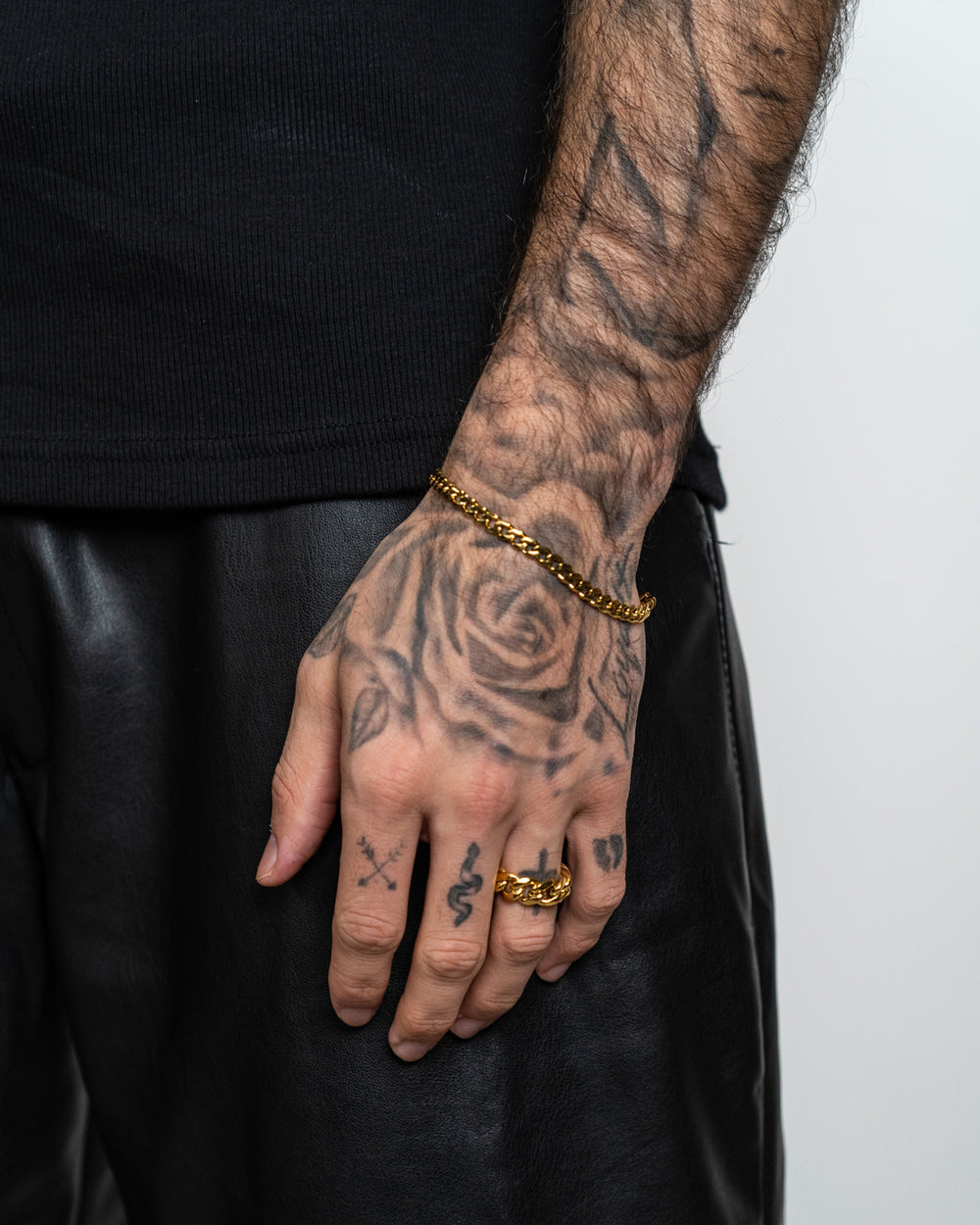 Pulsera cubana de 5 mm en acero inoxidable con baño de oro 18K, que combina diseño minimalista y elegancia lujosa.