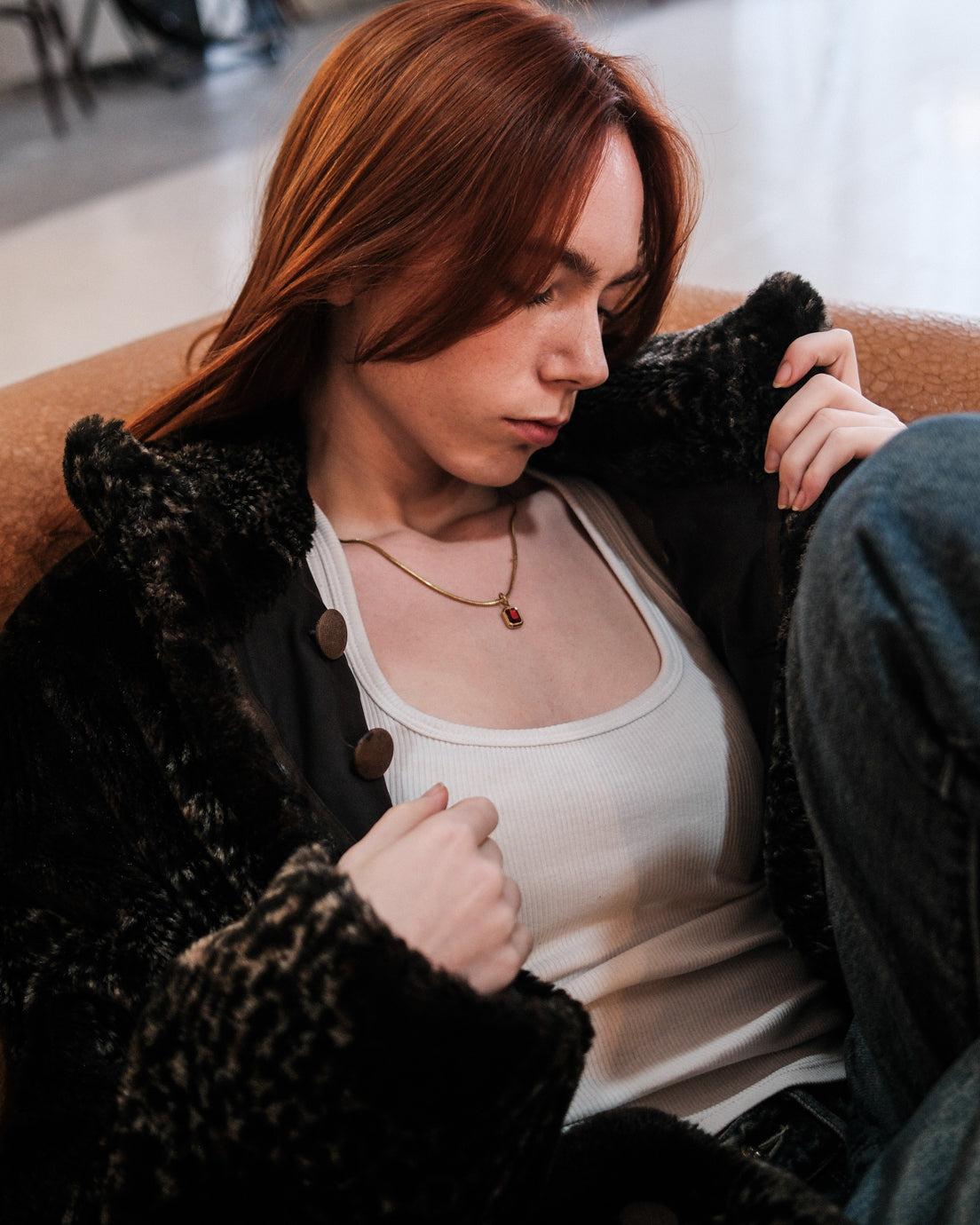 Collar de oro con colgante de piedra en tonos rojo rubí intensos. Resistente al agua y diseñado para el día a día, combina color fuerte y estilo streetwear moderne.